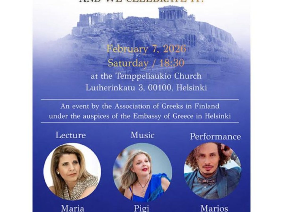 Με αφορμή τον εορτασμό της Παγκόσμιας Ημέρας Ελληνικής Γλώσσας (9 Φεβρουαρίου), ο Σύνδεσμος Ελλήνων Φινλανδίας, το Ευρωπαϊκό Σχολείο και η Ελληνική Πρεσβεία στο Ελσίνκι διοργανώνουν ένα διήμερο λόγου και μουσικής, αφιερωμένο στην άσβεστη φλόγα του Έλληνος Λόγου που με ιερό του όχημα την Ελληνική Γλώσσα, επιμένει μέσα στο διάβα των χιλιετηρίδων να φωτίζει και να διδάσκει στον άνθρωπο την συμπαντική Σοφία.και μάθετε πρώτοι όλες τις ειδήσεις