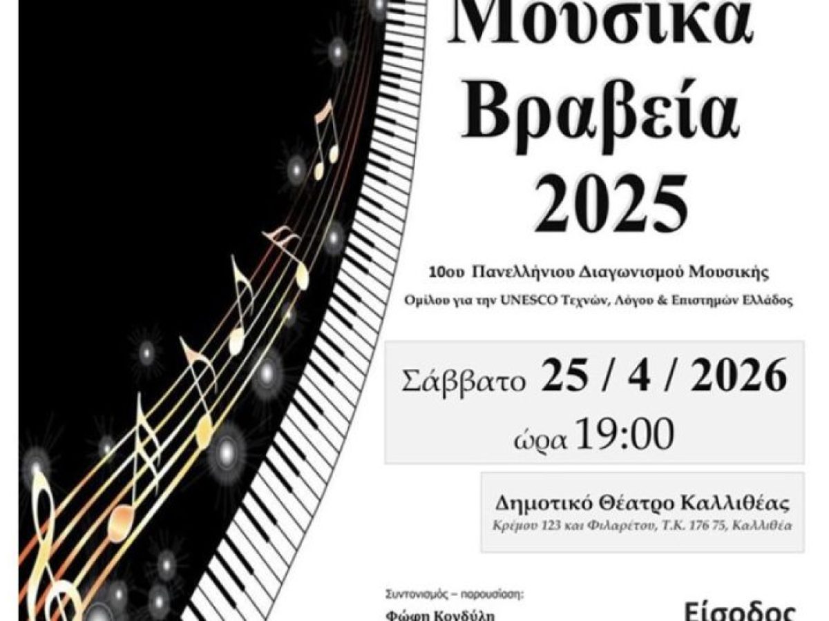 Ο Όμιλος για την UNESCO Τεχνών, Λόγου & Επιστημών Ελλάδος και ο Δήμος Καλλιθέας σας προσκαλούν το Σάββατο 25 Απριλίου 2026 και ώρα 19.00 στην τελετή απονομής των βραβείων του 10ου Πανελλήνιου Διαγωνισμού Μουσικής 2025, για παιδιά και νέες – νέους μουσικούς 9 – 30 ετών. Η εκδήλωση φιλοξενείται στο Δημοτικό Θέατρο Καλλιθέας (Κρέμου 123 και Φιλαρέτου, Τ.Κ. 176 75).και μάθετε πρώτοι όλες τις ειδήσεις