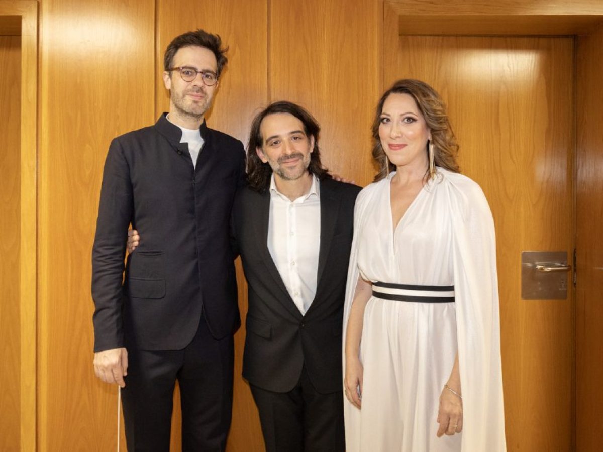 Ο μαέστρ Ντίνις Σόουζα, ο σολίστ πιανίστας Μάνος Κιτσικόπουλος και η Ελένη Καλένος.